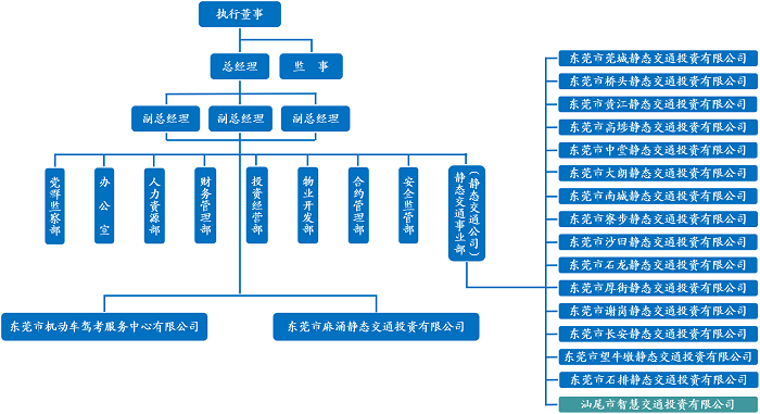 目前,交通實(shí)業(yè)公司管理層設(shè)執(zhí)行董事、總經(jīng)理、監(jiān)事和副總經(jīng)理。公司內(nèi)設(shè)“7部1室1事業(yè)部”,分別為黨群監(jiān)察部、辦公室、人力資源部、財(cái)務(wù)管理部、投資經(jīng)營(yíng)部、物業(yè)開(kāi)發(fā)部、合約管理部、安全監(jiān)管部及靜態(tài)交通事業(yè)部,下設(shè)東莞市機(jī)動(dòng)車駕考服務(wù)中心有限公司、東莞靜態(tài)交通投資有限公司。公司員工約450人,隊(duì)伍結(jié)構(gòu)較為年輕,管理人員平均年齡為31歲。