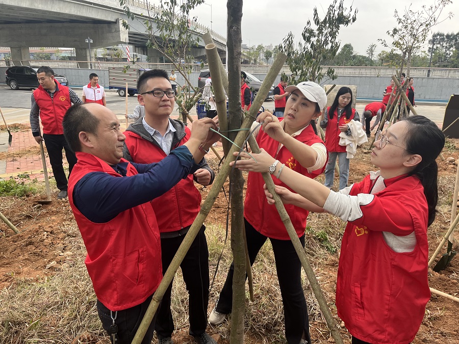 隨后,參加人員前往芙蓉產業(yè)中心開展植樹活動,黨員們熱情高漲、干勁十足,現場一片忙碌的景象。大家團結協(xié)作、配合默契。經過通力合作,一棵棵樹苗整齊地挺立在綠地上,與金燦燦的黨徽、鮮紅的黨員志愿服相映形成一道亮麗的風景線。下來,我司將持續(xù)發(fā)揮基層黨組織戰(zhàn)斗堡壘作用和黨員干部先鋒模范作用,引導黨員干部當好“綠美莞邑”的參與者,探索開展多形式黨建共建活動,為推動“百千萬工程”貢獻更大力量。