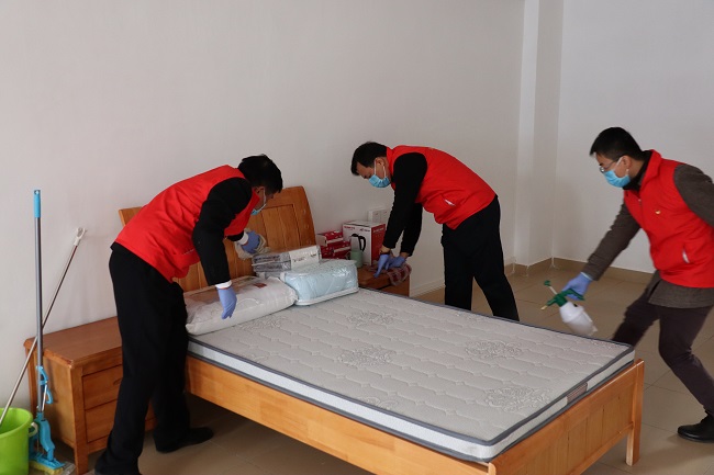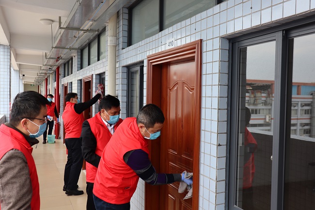 在詳細(xì)了解了集中健康觀察場所的物資配備和管控措施等情況后,隊(duì)員們開展了噴灑消毒液、全面擦拭消毒場所門把手、窗戶等工作。