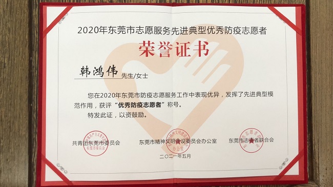 根據(jù)團(tuán)市委、市文明辦、市志愿者聯(lián)合會(huì)近日發(fā)布的《關(guān)于命名2020年度東莞市志愿服務(wù)先進(jìn)典型的決定》,交通實(shí)業(yè)公司獲評(píng)2020年度東莞市志愿服務(wù)先進(jìn)典型愛心企業(yè),下屬黃江靜態(tài)交通公司韓鴻偉同志獲評(píng)2020年度東莞市志愿服務(wù)先進(jìn)典型優(yōu)秀防疫志愿者。