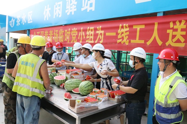 為切實(shí)做好一線人員的防暑降溫工作,8月24日下午,交通實(shí)業(yè)公司黨總支部副書記、監(jiān)事劉拓瑜,黨總支部委員、副總經(jīng)理琚明杰帶領(lǐng)黨群監(jiān)察部、工程管理部及企石深巷考場(chǎng)臨時(shí)黨小組成員,與企石深巷村一起到企石深巷考場(chǎng)施工現(xiàn)場(chǎng),為高溫下堅(jiān)守在一線的工人們送上藿香正氣水、涼茶飲品、西瓜等防暑用品,并一一發(fā)放到工人手中,對(duì)他們不懼炎熱、堅(jiān)持作業(yè)的精神表示贊揚(yáng)和感謝,同時(shí)叮囑大家在快馬加鞭大干期間,要根據(jù)露天施工作業(yè)體能消耗大的實(shí)際情況,合理調(diào)配作業(yè)時(shí)間,注意防暑降溫、勞逸結(jié)合,保證身體健康,確保各項(xiàng)工作有條不紊地進(jìn)行。施工現(xiàn)場(chǎng)負(fù)責(zé)人表示,將繼續(xù)加大防暑降溫投入,合理安排工人作業(yè)時(shí)間和勞動(dòng)強(qiáng)度,確保大家平穩(wěn)度過高溫施工階段。